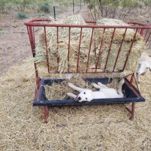 The six puppies in the bonding project are all doing well and growing rapidly. The Maremma pups are now 15 weeks old and the Akbash cross pups are 11 weeks old. They all have different individual personalities, but similarities exist based on the breeding and rearing environment of the breeder we sourced the dogs from. In general, the Maremma pups are a little more timid, while the Akbash cross pups are a little more adventurous. This could be “nature” or “nurture.” The Akbash pups received more human contact while they were with their mother than the Maremma puppies did. It will be interesting to see which set of pups end up bonding more to livestock when they are mature. All the pups are leading well on a leash and just lay down when tethered now. Thor and Hulk really enjoy riding in the truck.