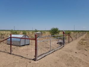 The pups were randomly selected to be in each pen. The pups are split with two puppies together in two pens and a single puppy in each of the other two pens. This demonstration project will demonstrate how sibling behavior affects how well the puppies bond to the livestock as they mature. We are also demonstrating if the effect of hot wire in the bonding pen will keep the pups from roaming once they are mature and placed on our research ranches.